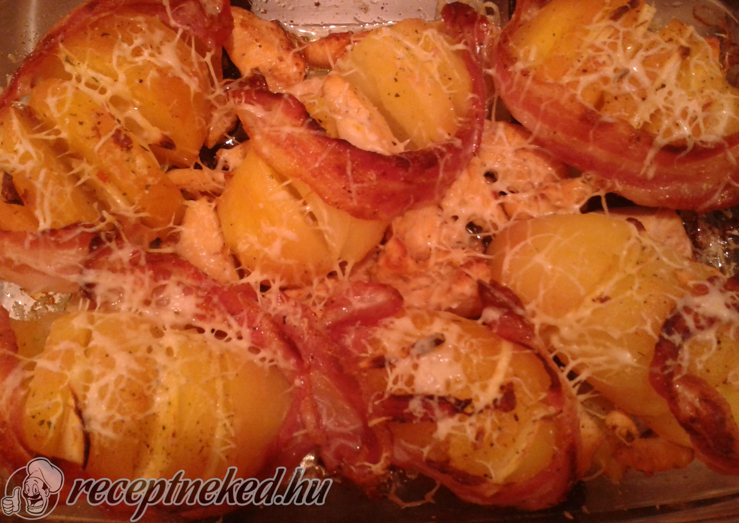 A megfőtt burgonyát megtisztítjuk, majd fél centiként bevagdaljuk és megsózzuk. A vágásokba töltjük a karikára vágott hagymákat, majd olívaolajjal kikent sütőtálba tesszük. Közékeverjük a pirított csirkemelleket és minden burgonya köré bacont rakunk.