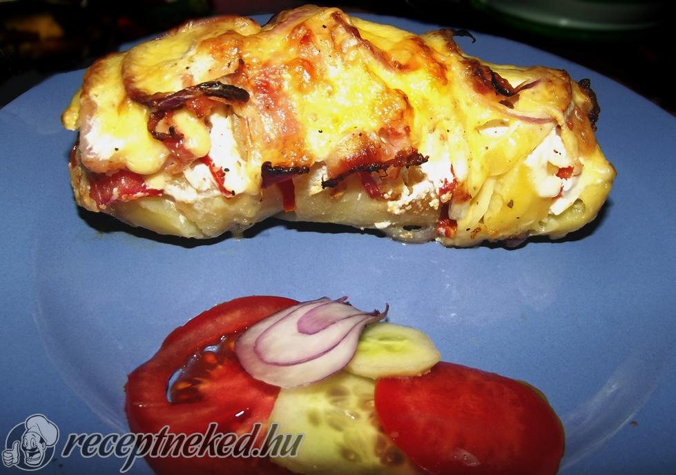 A közben feldarabolt hozzávalókat a burgonyák közé töltjük, fűszerezzük, majd tejföllel meglocsoljuk az egészet. Ha valamelyik hozzávaló nem fér bele – például a tojás –, azt a tetejére helyezzük. Az egészet bacon szeletekkel lefedjük.