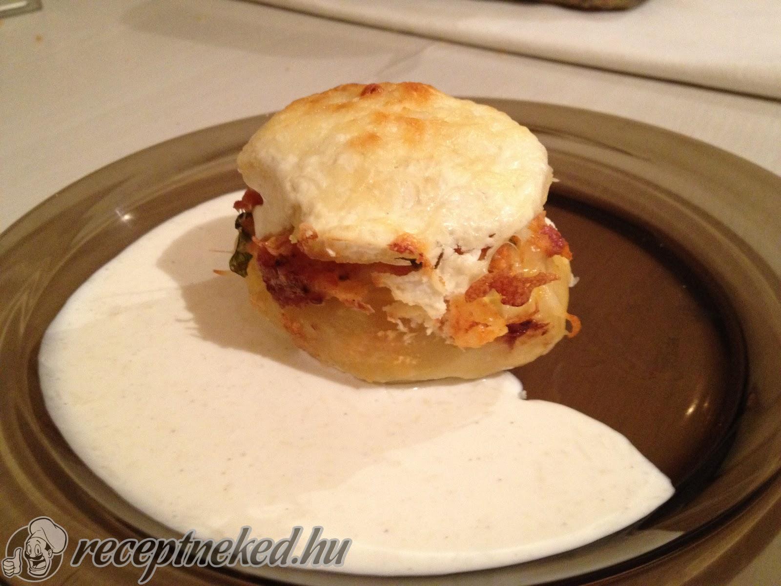 Egy kivajazott tűzálló tálba ültetjük a kivájt burgonyákat, és megtöltjük a húsos keverékkel. 180 °C-on kb. 25 percig sütjük. Ezután visszatesszük a tetejüket, a burgonyákat gazdagon meglocsoljuk tejföllel, megszórjuk a maradék reszelt sajttal, és további 15 percre visszatesszük a sütőbe. Akkor jó, ha a sajt szépen megpirult.