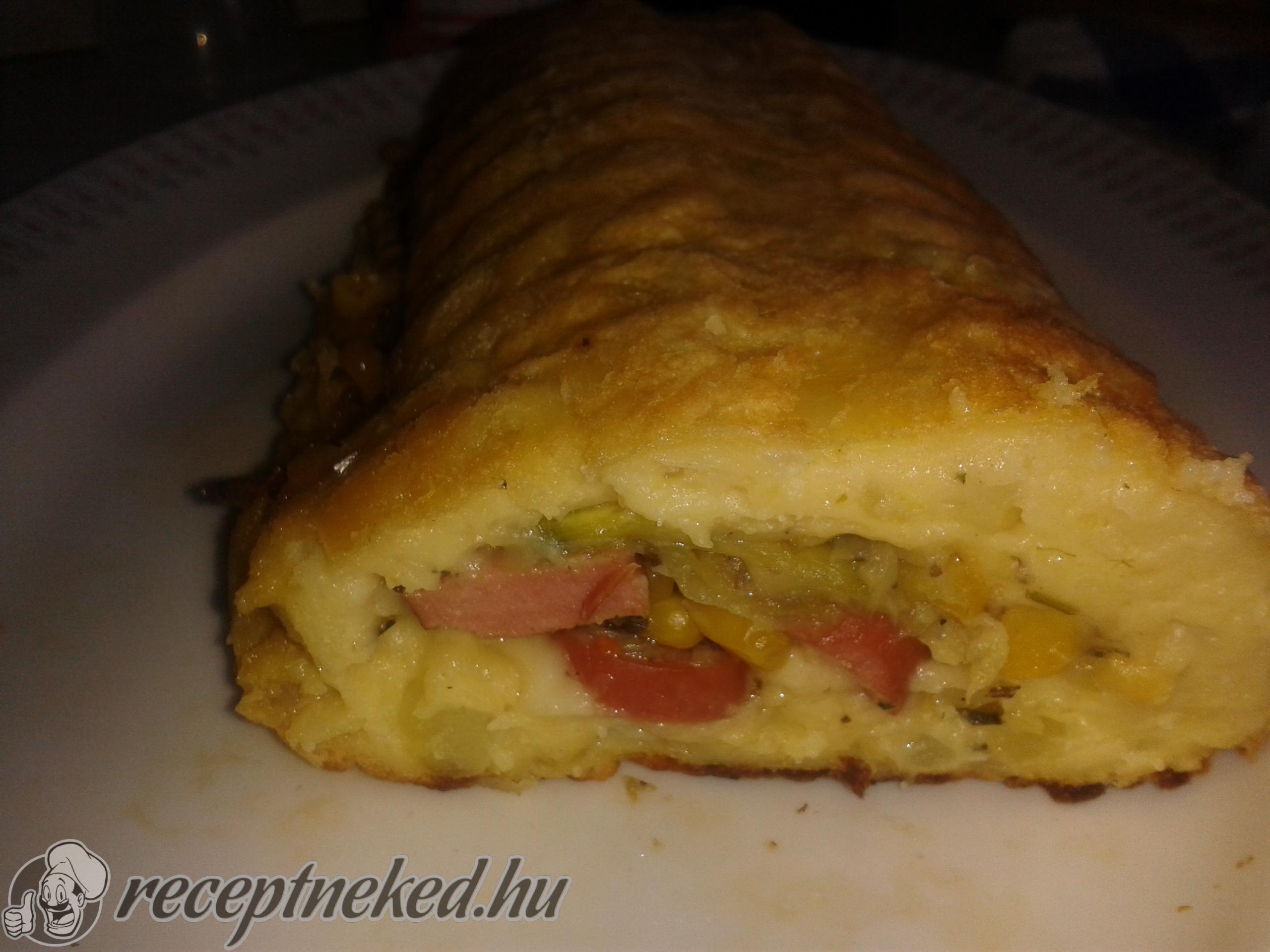 Amíg hűl, elkészítjük a tölteléket, ami szinte bármi lehet. A virslit felszeleteljük, majd kevés olajon elkezdjük sütni. Ha már van rajta kéreg, akkor hozzáadjuk a megpucolt és feldarabolt cukkinit, az apróra vágott petrezselymet, a kukoricát, majd ízlés szerint sózzuk, borsozzuk és oregánót adunk hozzá. Elforraljuk a levét.