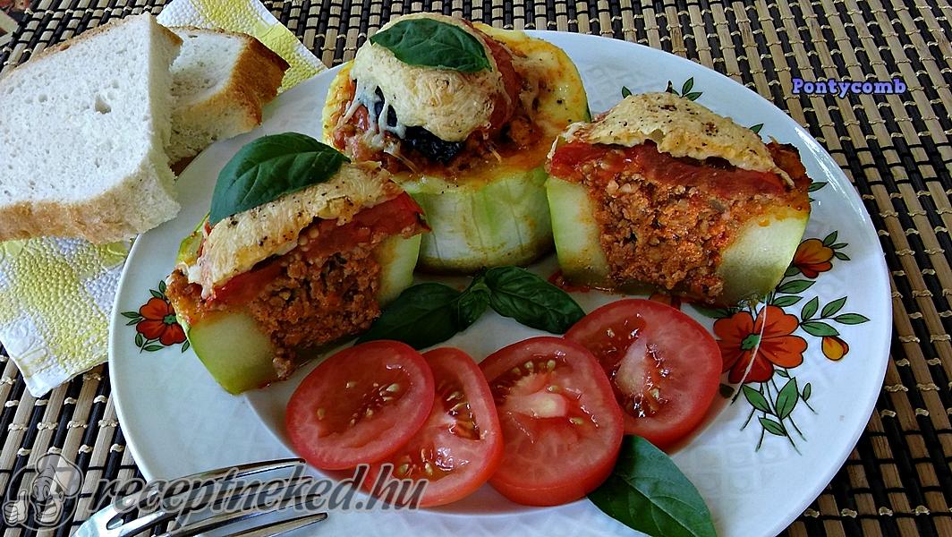 A 3 db paradicsomot vastagabb karikára vágjuk, és minden töltött cukkinire ráteszünk 1 db-ot. Ezután bazsalikom levéllel folytatjuk és a tetejét jó nagy csipet reszelt sajttal zárjuk.