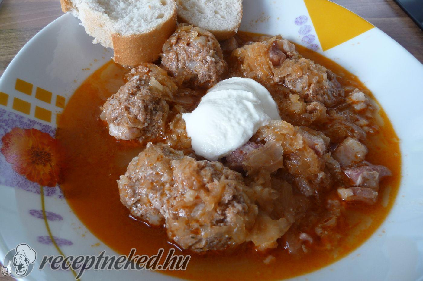 A húsgolyók tetejére kerül a maradék savanyú káposzta és a szalonna. Felöntjük annyi vízzel, hogy ellepje, és ha felforrt, akkor kisebb lángon 2-3 órán át főzzük.