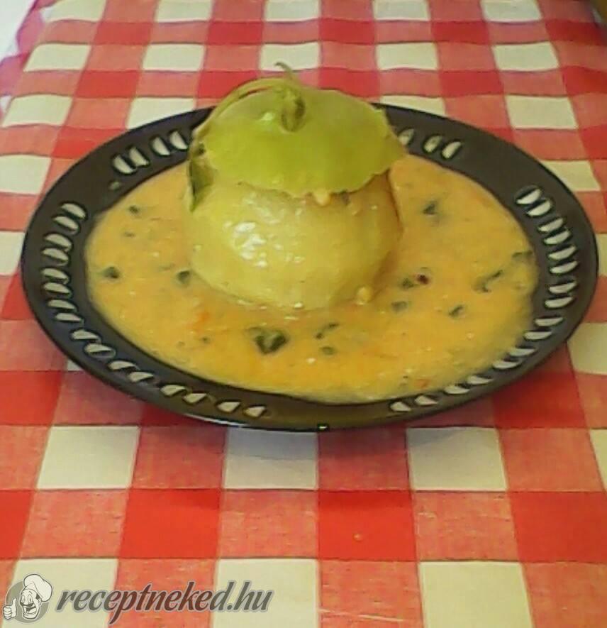 Tálaláskor a töltött karalábét tányérra szedjük és mellé kanalazzuk a szószt.