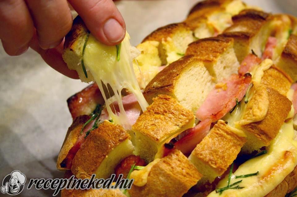 A sütőt előmelegítjük. A kenyeret hosszában és keresztben is bevágjuk, de figyelve arra, hogy a kenyér alját ne vágjuk át.