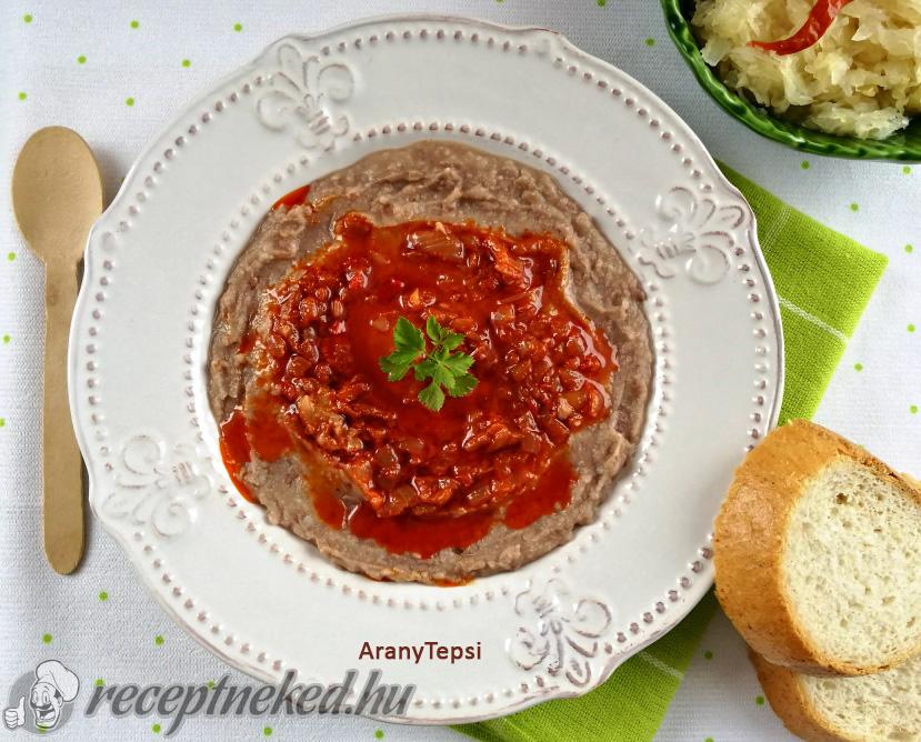[box style=”info”]Ez az az étel, amit már többször ettem, de még sohasem készítettem. Eddig. Mamám régen sokat csinált, de sajnos tőle már nem tudom megkérdezni, hogy mi is a receptje. Aztán nézelődtem a neten és van, aki tesz bele lisztet, van, aki babérlevéllel ízesíti. Én most a saját szánk íze szerint, babérlevél nélkül főztem meg. Igaz, csak tarkababunk volt itthon, ezért a színe nem épp a leggusztusosabb, az íze viszont remek lett. Jó sok pirított hagymával, savanyú káposztával ettük, és kenyérrel tunkoltuk. Egyszerű, húsmentes, és mégis nagyon laktató fogás.[/box]