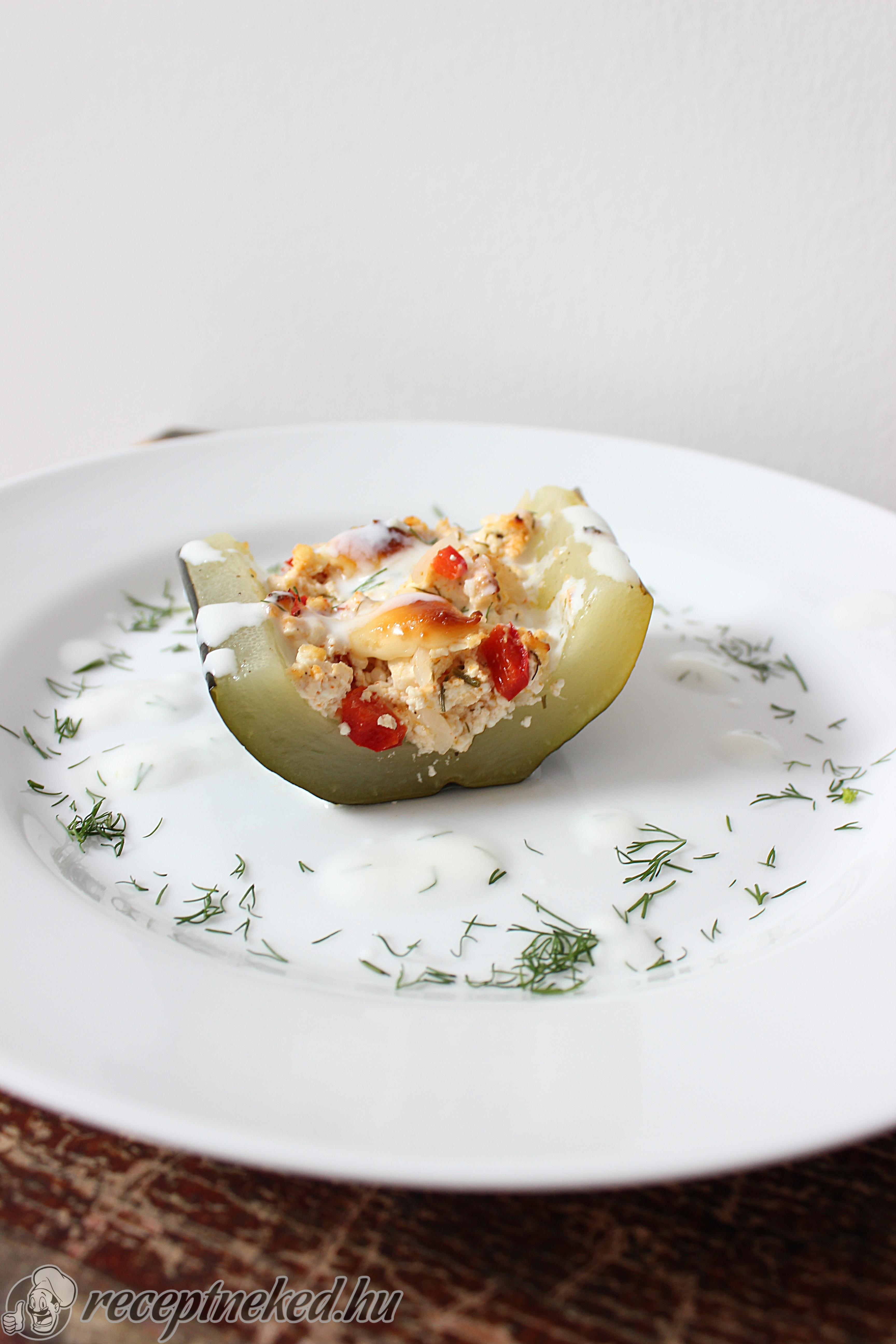 Közben elkészítjük a tölteléket. Ehhez az apróra felkockázott pirospaprikát roppanósra pirítjuk, majd a felkarikázott újhagyma, az őrölt pirospaprika, a felszeletelt kapor nagy része és némi só-bors társaságában belekeverjük a túróba. Kész is a töltelék, belekanalazhatjuk a cukkinibe. A tetejét szórjuk meg a felkockázott sajttal.