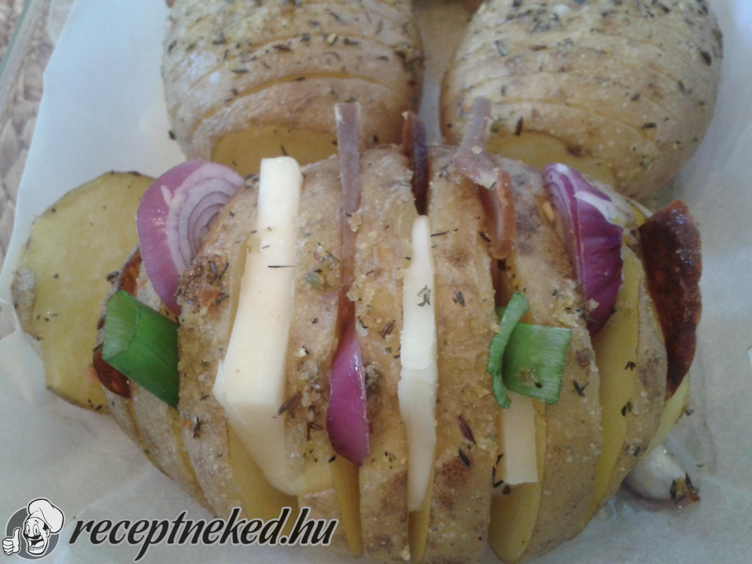 A sütés vége felé a krumplik vágásaiba vékony sajtszeleteket, hagymakarikákat, szalonna- és sonkaszeleteket, kolbászkarikákat rakunk. A megtöltött krumplikat még tíz percre visszatoljuk a sütőbe.