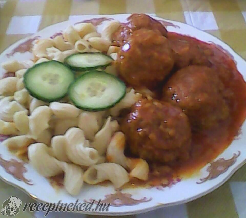 A tésztát sós, lobogós vízben kifőzzük, majd leszűrjük és leöblítjük. A húsgolyókat a tésztával tálaljuk.