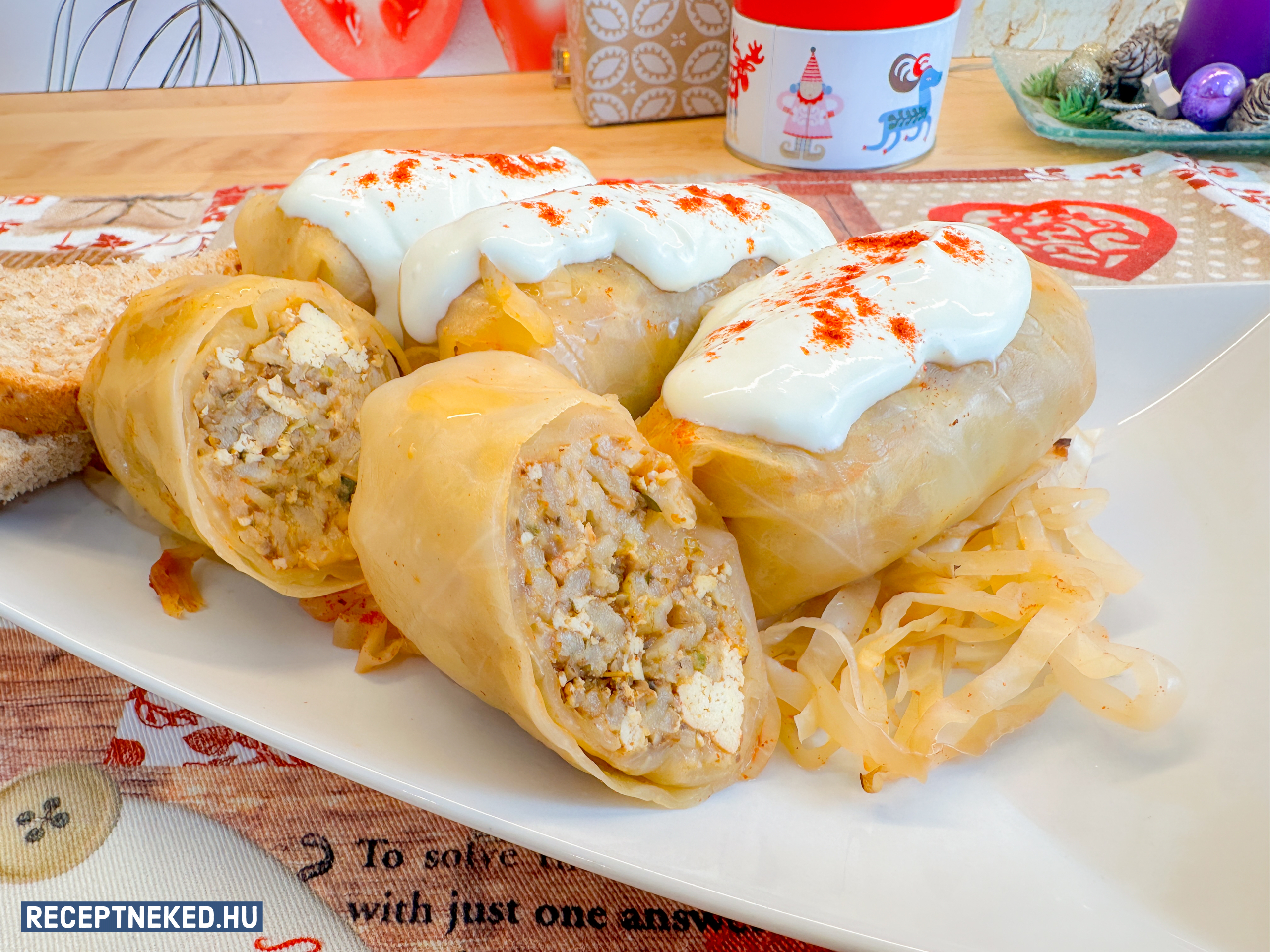 A savanyított káposzta leveleiből a vastag, eres részt kivágjuk és mindegyik levélbe kb 1,5-2 evőkanálnyi tölteléket göngyölünk. Ha vannak benne nagyobb levelek, azokat ketté is vághatjuk.