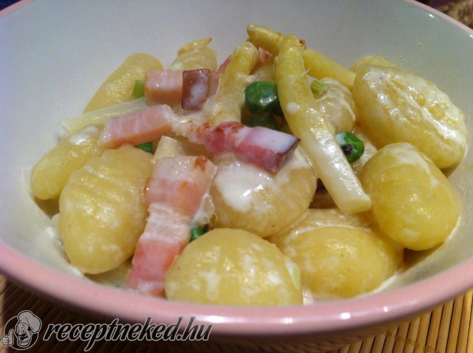 Egy nagyobb serpenyőben összekeverjük a megfőtt gnocchit, a megpirított szalonnát és hagymát, valamint a spárgát. Fűszerezzük sóval és borssal, majd hozzáöntjük a főzőtejszínt. Lassú tűzön kevergetve felforraljuk.