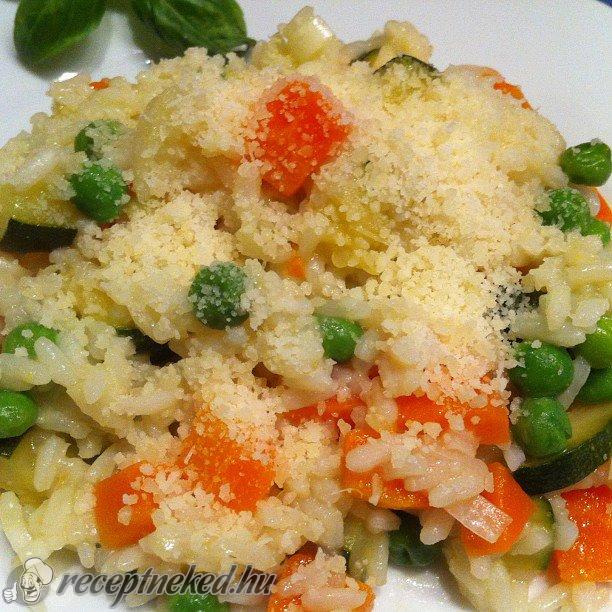 Az alaplevet felforraljuk, és forrón tartjuk a főzés során. Egy nagyobb edényben felforrósítjuk a zsiradékot, majd hozzáadjuk az apróra vágott vöröshagymát, a sárgarépát és a cukkinit. Megsózzuk, és közepes lángon 3 percig pirítjuk.