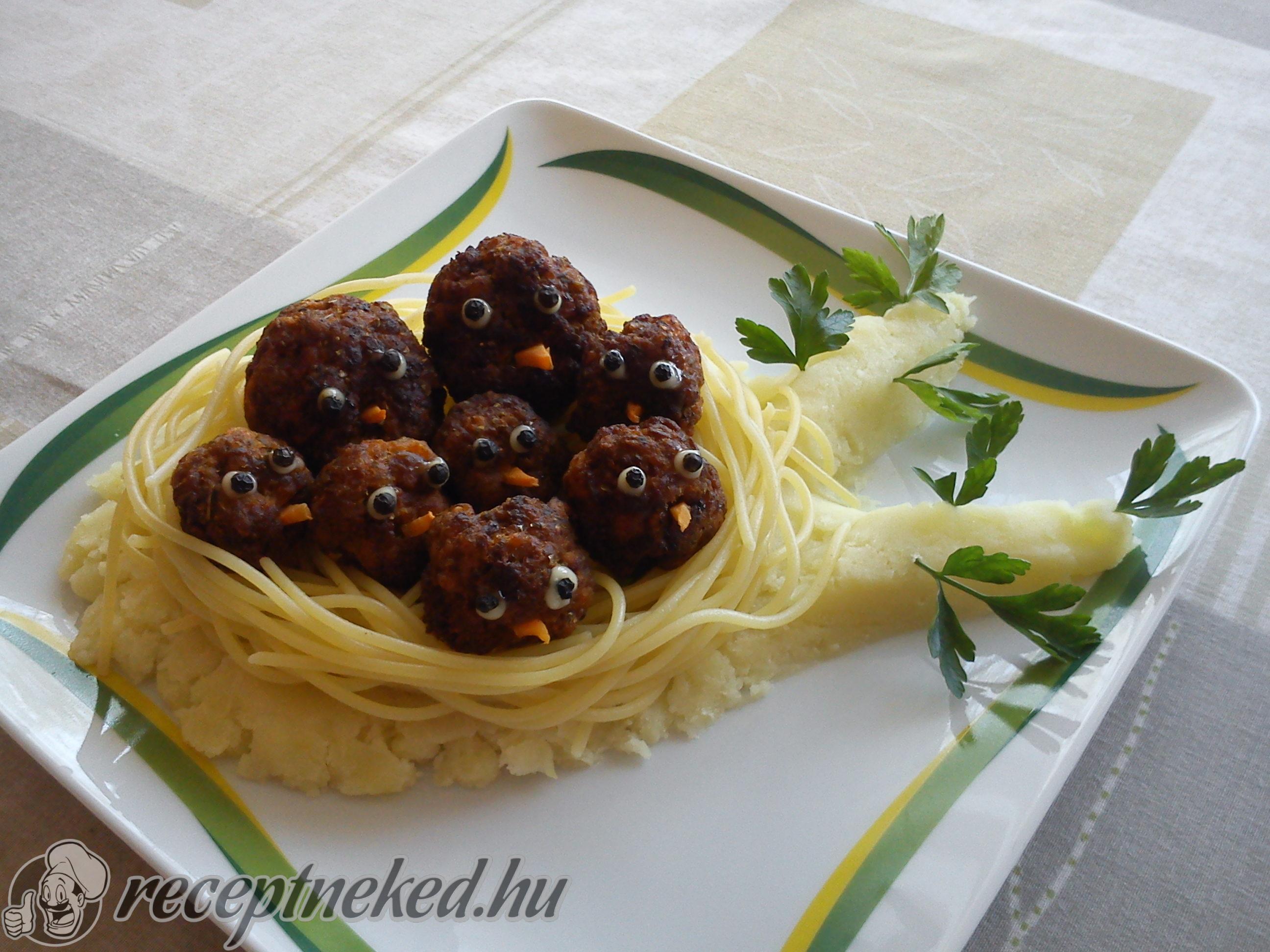 A fasírtgolyókat a majonéz és az egész bors segítségével szemekkel, a sárgarépából vágott apró darabokkal csőrrel díszítjük. A burgonyapürét a tálon ág formájában elrendezzük, a spagettiből készített fészekbe helyezzük a fasírt fiókákat, így alkotva meg a vidám tálalást.