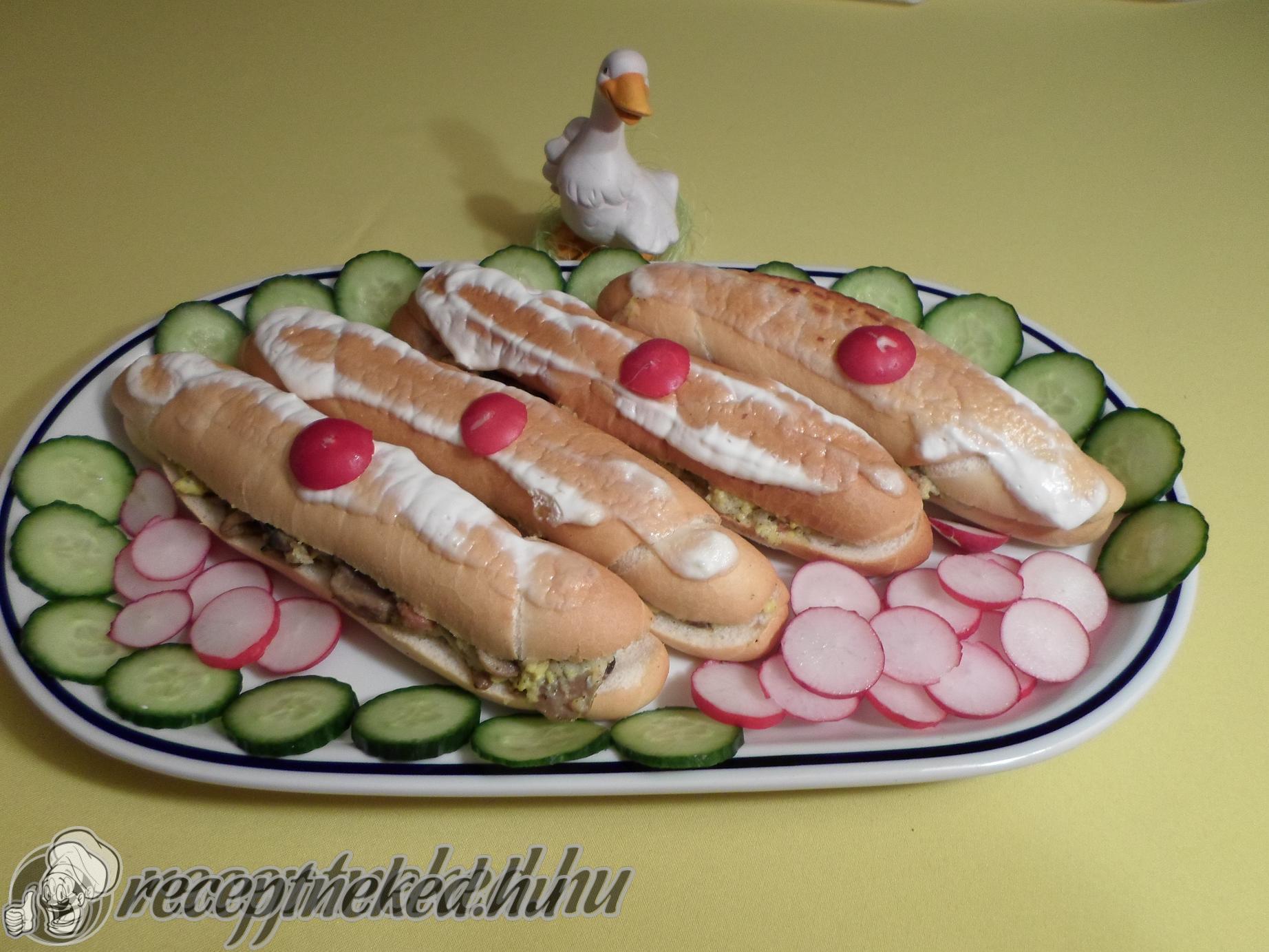 Kifliket ketté vágjuk, kivájjuk a belsejét és zöldségkeverékes tejjel meglocsoljuk kifli mindkettő felét.