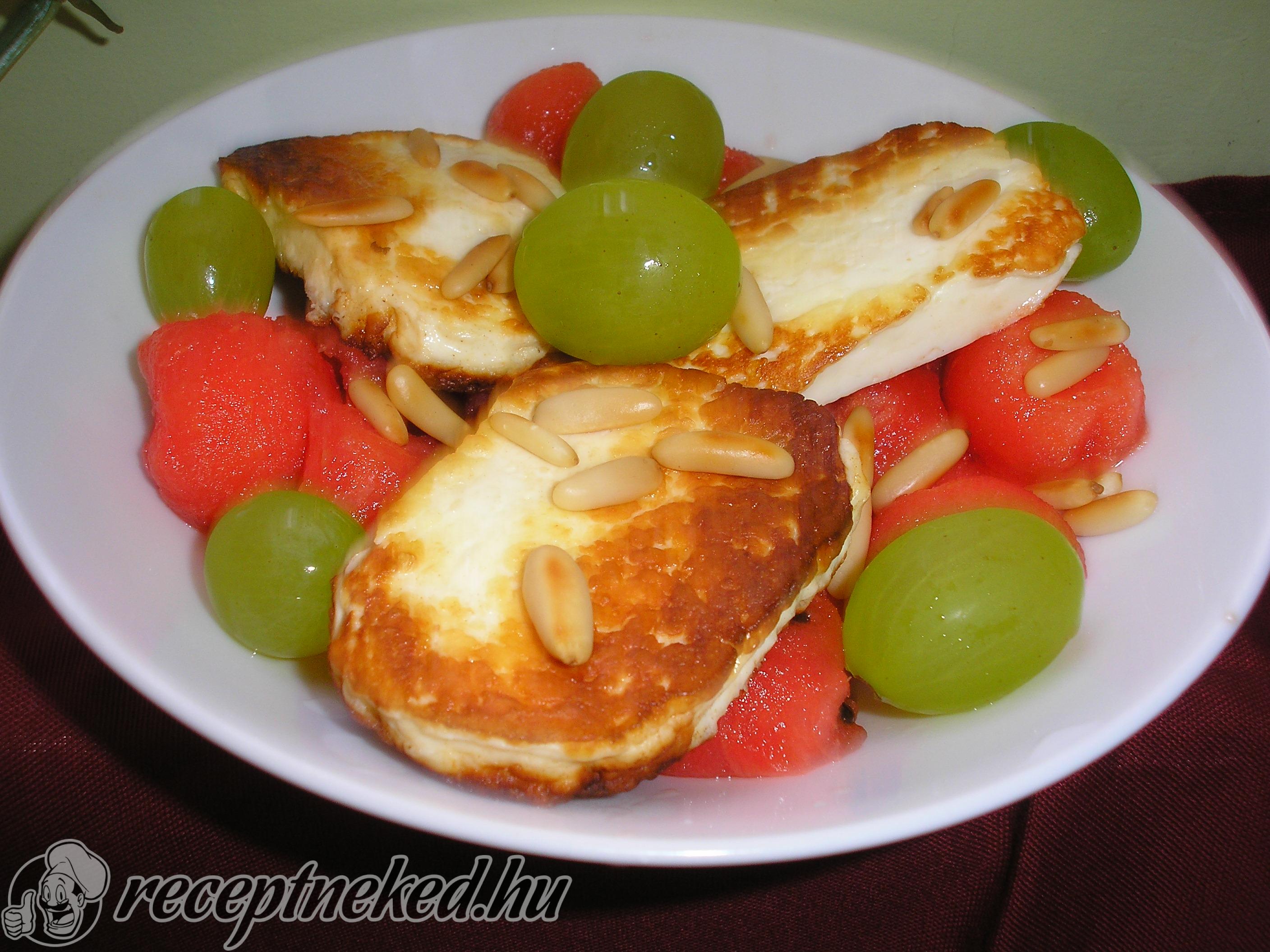 Serpenyőben szárazon megpirítom a fenyőmagot, és hagyom kihűlni. A dinnyegolyókat kis tálkába rendezem, köréje rakom a szőlőt, majd a grillezett sajtból ízlésesen 3-4 darabot a tetejére halmozok.