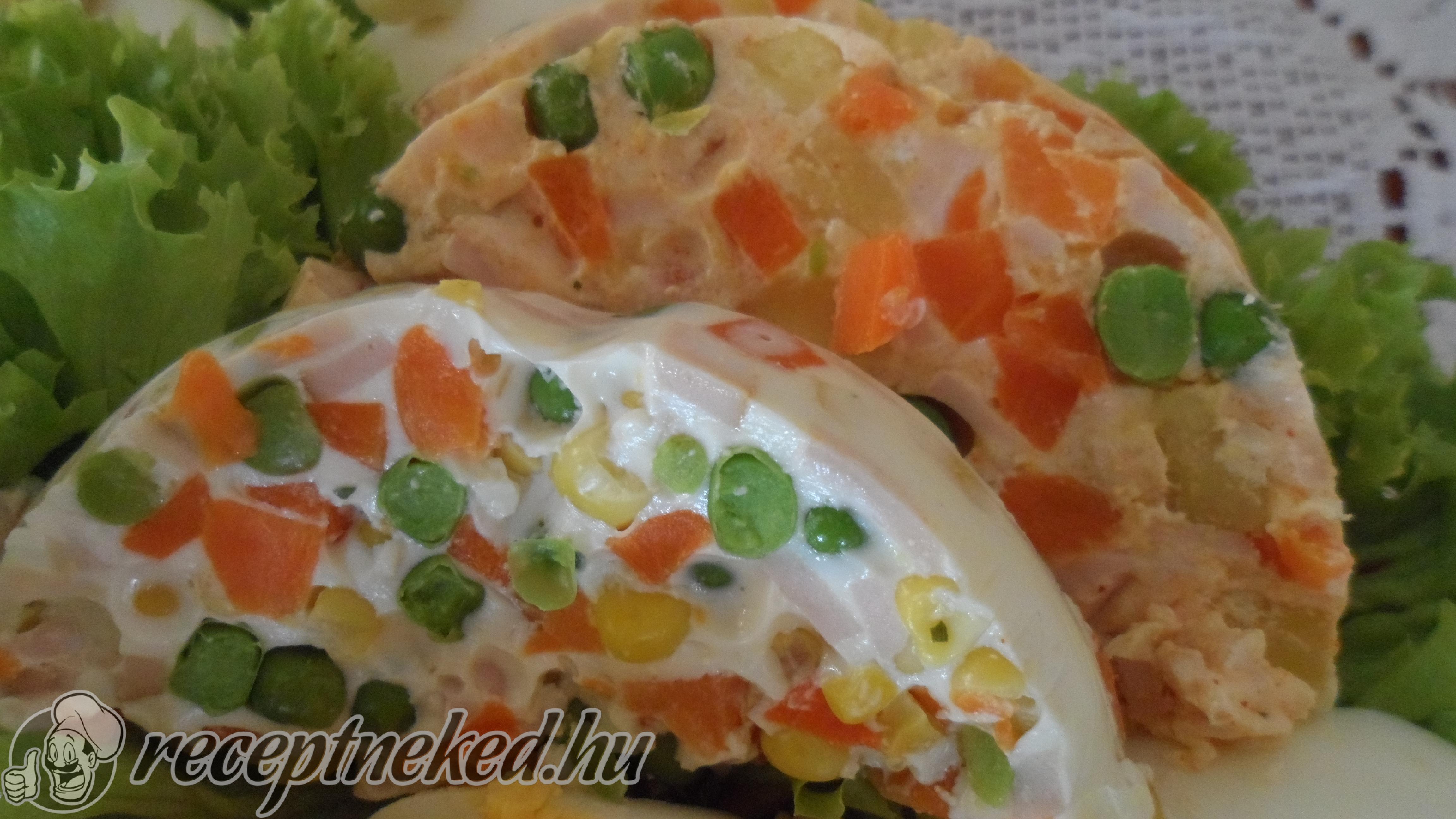 A zselatinra ráöntjük az 1 deciliter vizet és hagyjuk, hogy beszívja, jól megduzzadjon.Először a tartármártást készítjük el. A majonézhez hozzáadjuk a tejfölt, porcukrot, citromlevet, mustárt és ízlés szerint sózzuk, borsozzuk, majd az egészet jól összekeverjük.Ezután felvágjuk apróra a főtt sonkát, tojásokat, paprikát és a csemege uborkát, majd belekeverjük a tartármártásba. Ekkor adjuk hozzá a tormát is, ha szeretnénk.Az alaplevet vagy a vízből és leveskockából készített levet feltesszük a tűzre és hozzáadjuk az idő közben megduzzadt zselatint és alacsony lángon felolvasztjuk (nem szabad forralni!!).A zselatinos levet belekeverjük a sonkás masszába.Az őzgerinc formát folpackkal kibéleljük, majd beleszedjük a zselatinos masszát és néhány órára vagy egy éjszakára hűtőbe tesszük, hogy megdermedjen.Másnap óvatosan kiborítjuk a formából és lehúzzuk róla a folpackot, majd szeletelve tálaljuk.
