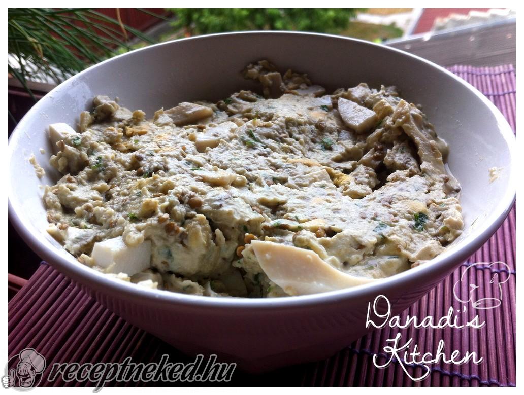 A főtt tojásokat apró kockákra vágjuk, majd a padlizsánhoz keverjük. Hozzáadjuk a finomra aprított vöröshagymát és petrezselymet. Sóval, borssal és provence-i fűszerkeverékkel ízesítjük, végül annyi majonézt adunk hozzá, hogy selymes, krémes állagot kapjunk.