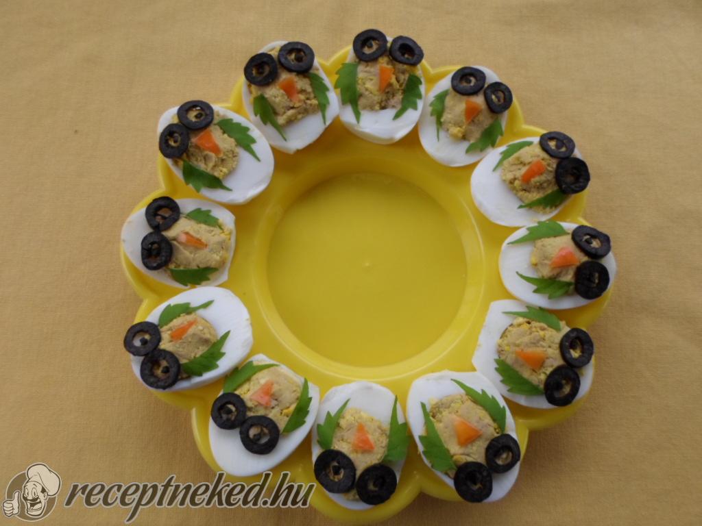 A sárgákat összekeverjük az apróra vágott hagymával, mustárral, tejföllel és a krémsajttal. Ízlés szerint megszórjuk őrölt borssal. Alaposan kikeverjük, majd visszatöltjük a tojásfehérjékbe.