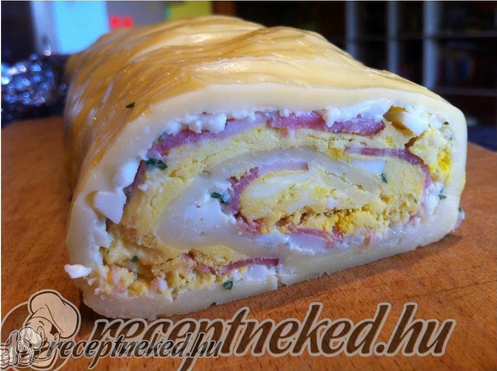 A tölteléket befedjük a tarja szeletekkel. Ezután elkészítjük a második réteget: a tojások sárgáját kikeverjük a mustárral és a puha vajjal, majd ízesítjük sóval és borssal. Ezt a keveréket a sonkára kenjük.