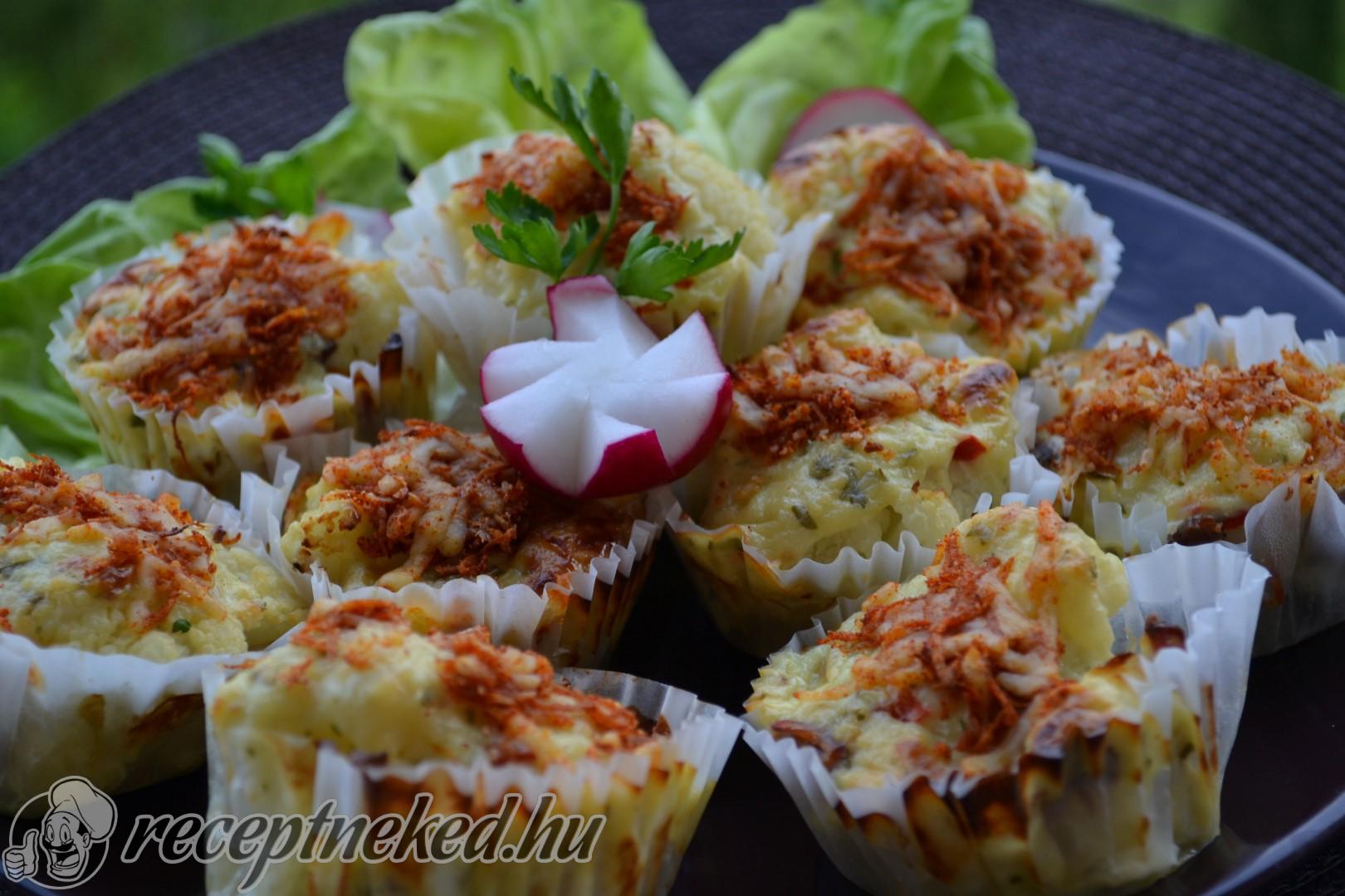 A félretett zsemlemorzsát keverjük el a maradék reszelt sajttal és egy kevés pirospaprikával. Szórjuk a muffinok tetejére, és tegyük vissza addig a sütőbe, amíg szépen megpirul a teteje.