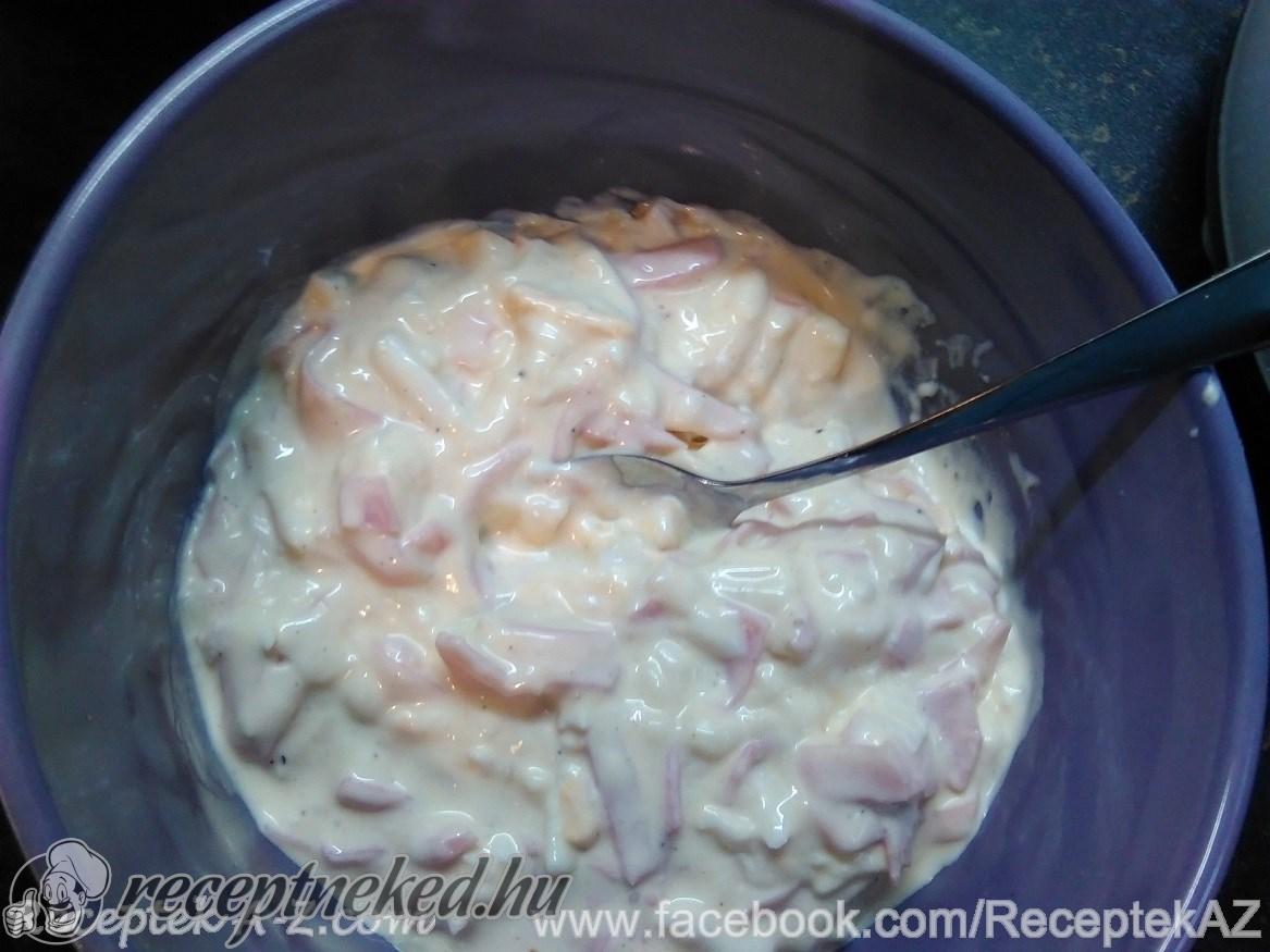 A gépsonkát felvágjuk apróra, a tojást és a sajtot felkockázzuk, a hagymát lereszeljük. Mindent egy tálba teszünk, majd ráöntjük a tejfölt és a majonézt, megízesítjük sóval, őrölt fekete borssal. Alaposan átkeverjük, és hideg helyen hagyjuk összeérni az ízeket.