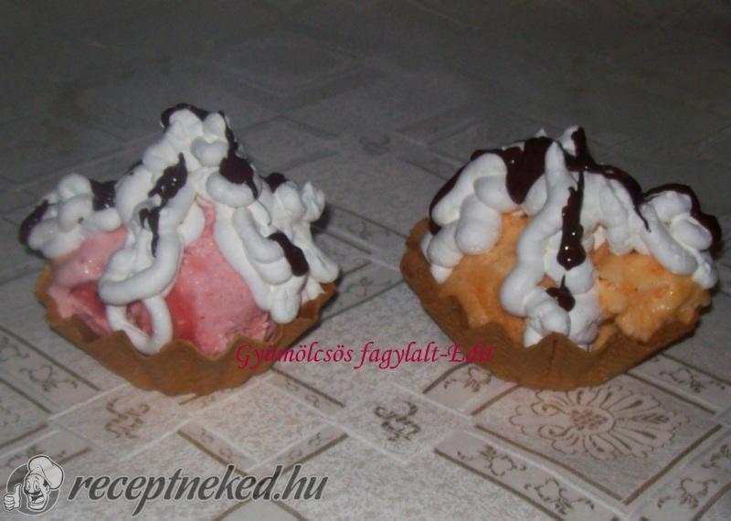 Sárgabarackból és eperből készítettem, de bármely gyümölccsel kiváló. Kis fagyis kosarakban tálaltam. Tejszínnel és csokival fogyasztottuk.