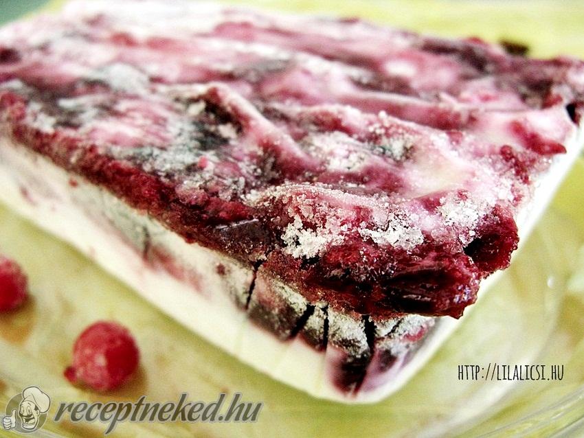 Közben verjük habbá a tejszínt, majd adjuk hozzá a joghurtot és a citrom reszelt héját. Béleljünk ki egy 10*25 cm-es formát sütőpapírral, majd egyenletesen elosztva öntsük bele a tejszínes-joghurt krémet és fedjük be a lehűtött gyümölcsszósszal.
