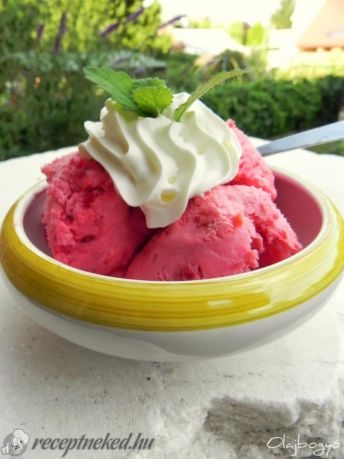 Habtejszínt kemény habbá verem és óvatosan a cukros gyümölcsös mázhoz keverem. A tojások fehérjét is habbá verem és szintén óvatosan a masszához keverem-forgatom.A fagyi alapunkra friss gyümölcsöt szórok, vagy tört gyümölccsel örvény formában a mázhoz keverem. A variációk sora kimeríthetetlen 🙂
