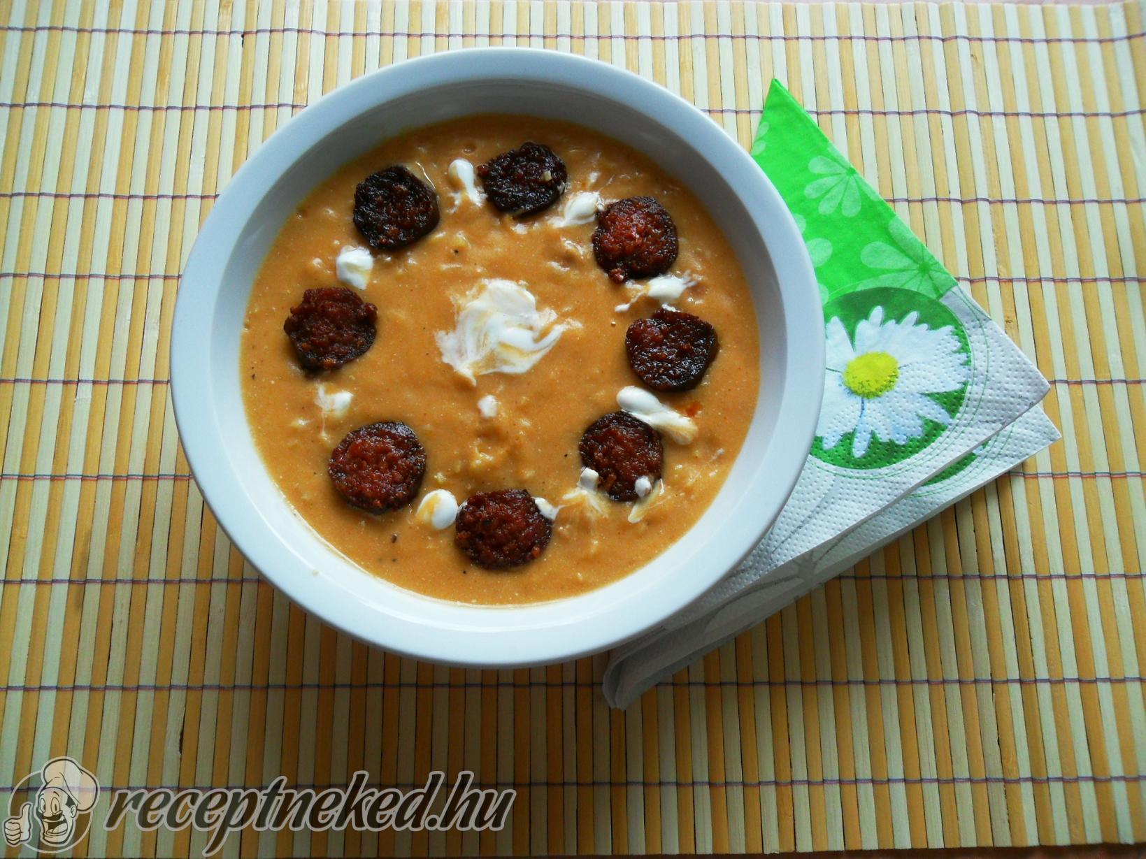 Sült kolbásszal és tükörtojással kínáljuk. Természetesen nem maradhatott el a friss kenyér sem mellőle.