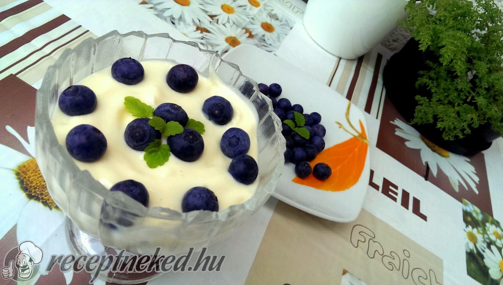 Kevés joghurtot teszünk rá, majd megszórjuk a (búzakorpával) magokkal áfonyával, ráöntjük a többi joghurtot és a maradék áfonyával díszítjük.