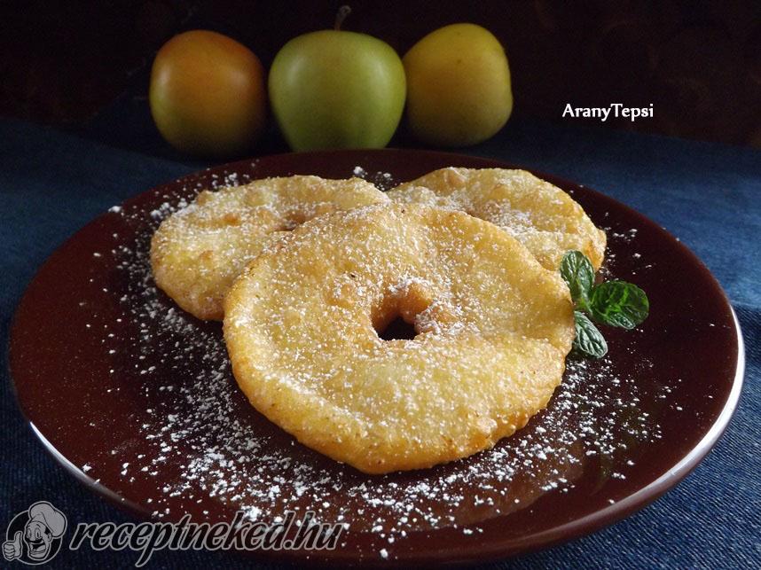 Olajat forrósítunk. Az almakarikákat először lisztbe forgatjuk, majd a masszába mártjuk és a forró olajban közepes lángon szép világosra sütjük. Papírtörlőre szedve hagyjuk a felesleges olajat lecsepegni.
