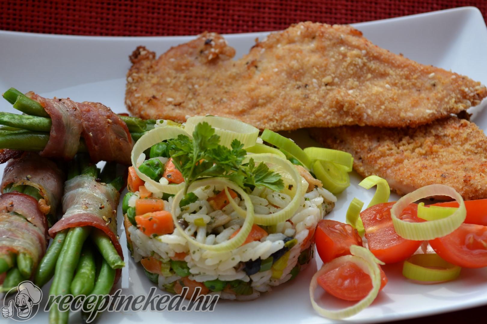 Majonézzel, ketchuppal és paradicsommal tálaljuk.