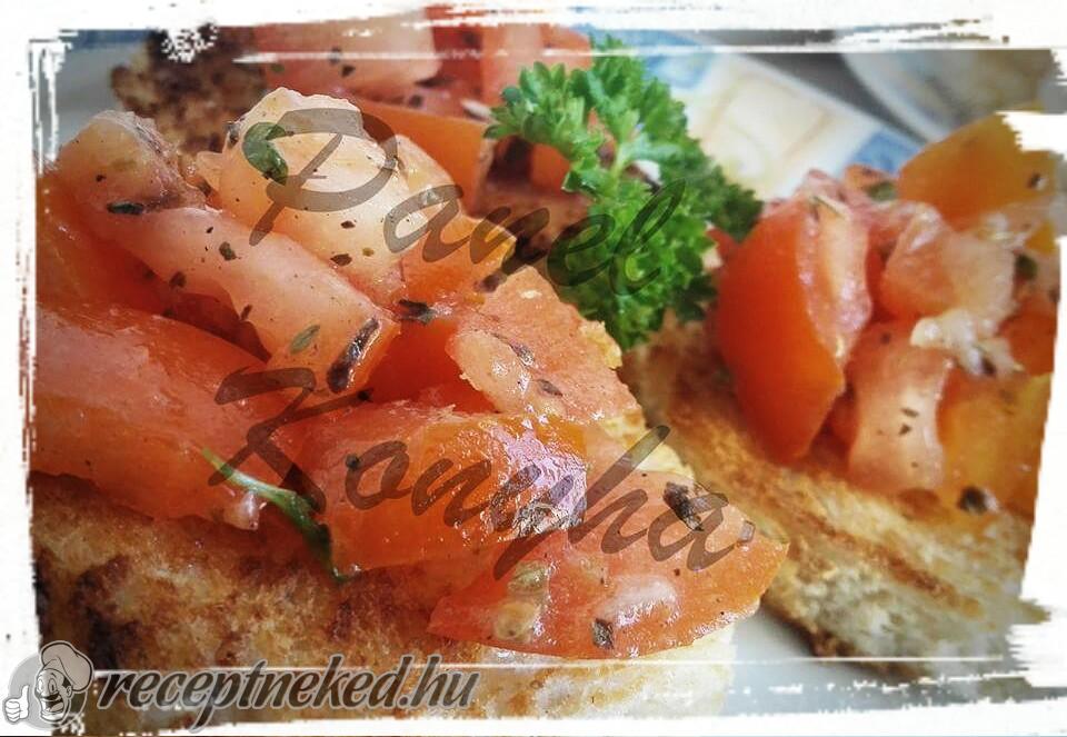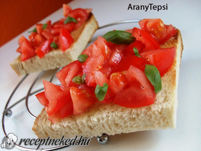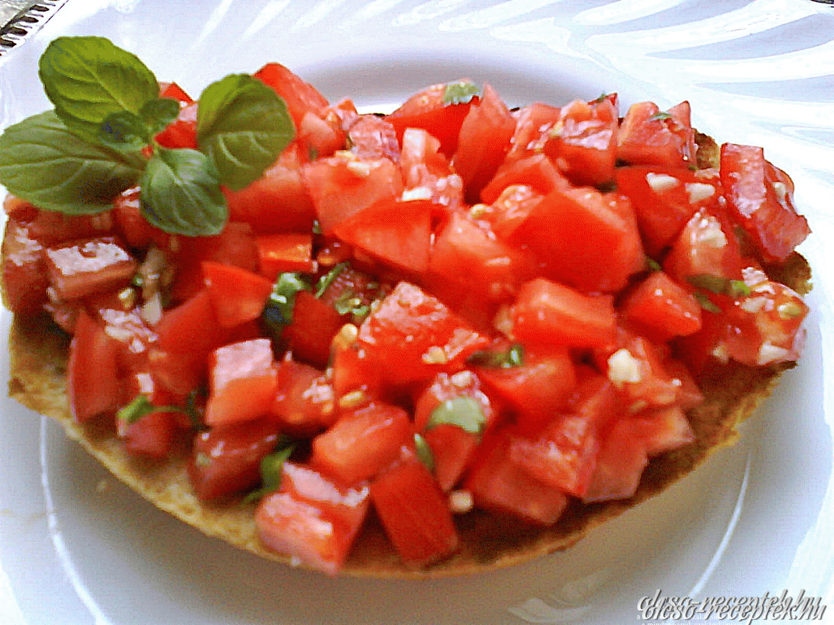 A paradicsomokat apróra kockázzuk és egy tálba tesszük. A fokhagymát késsel szétnyomjuk, aprítjuk, majd mehet hozzá az aprított bazsalikom, só, bors, étolaj és addig állni hagyjuk, amíg a sütőben elősütjük a kenyérszeleteket.