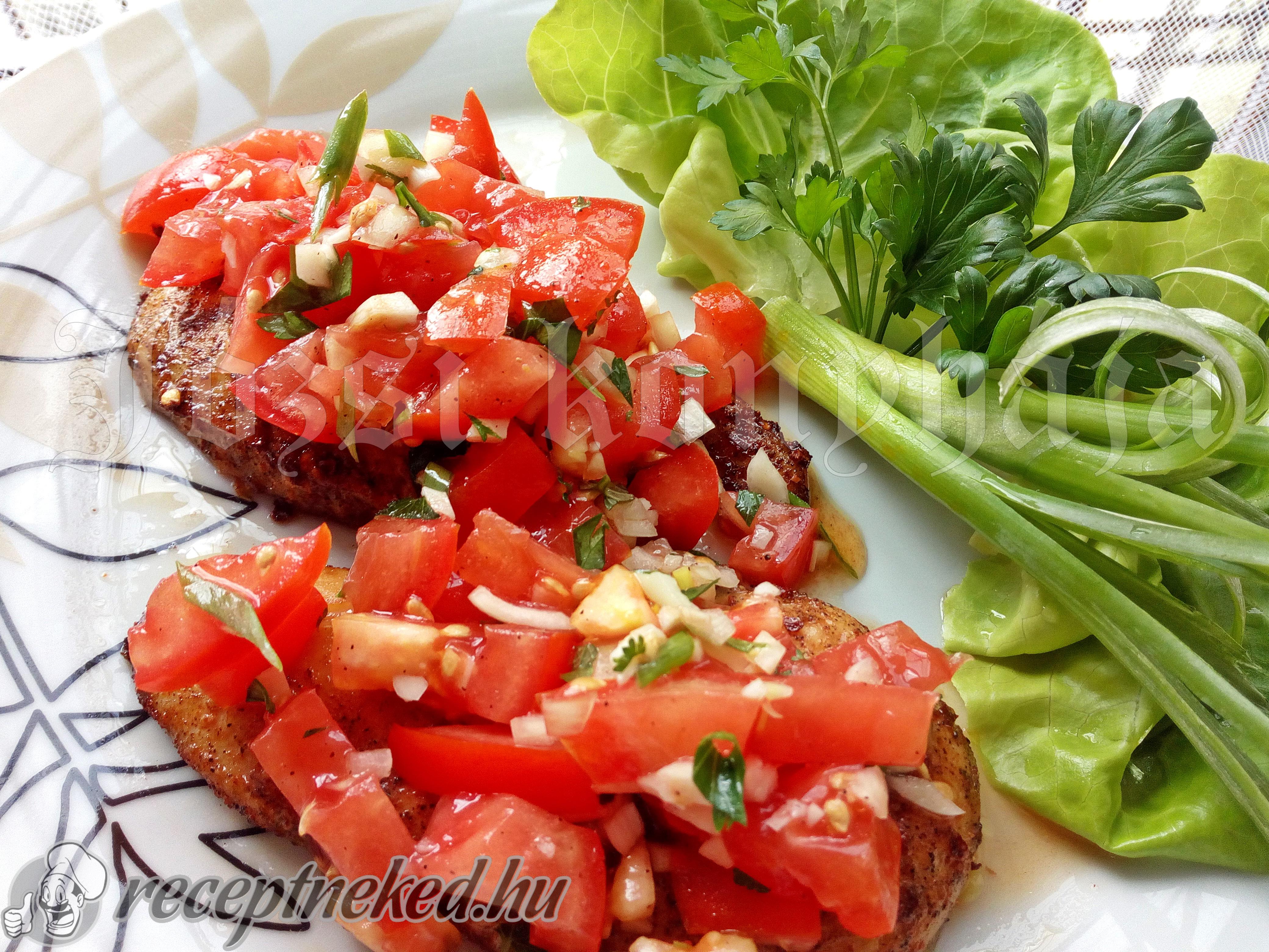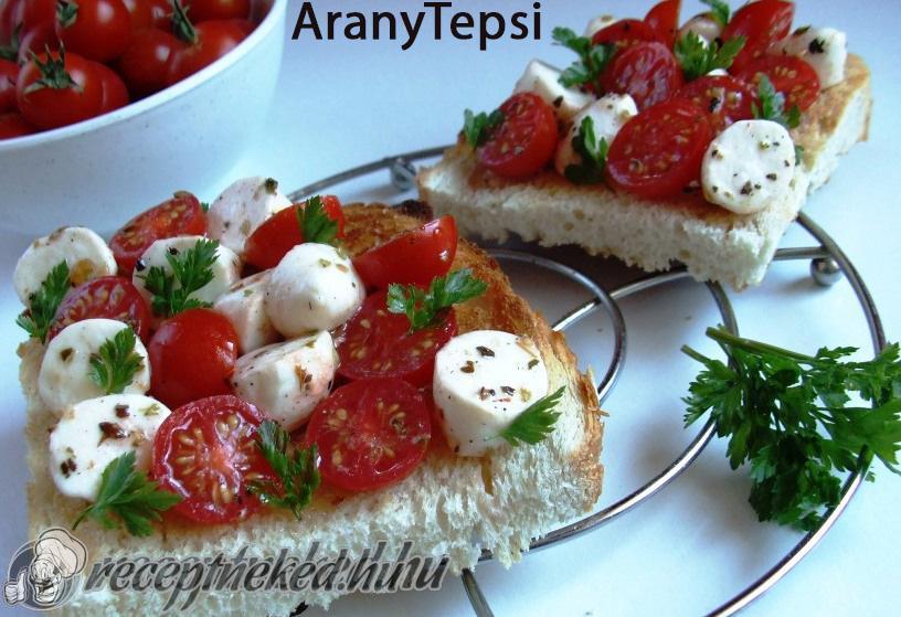 A sütőt grillező fokozatra állítjuk. A kenyérszeleteket mindkét oldalukon kb 2-2 percig pirítjuk. Ezután kivesszük és rákanalazzuk a paradicsomot.