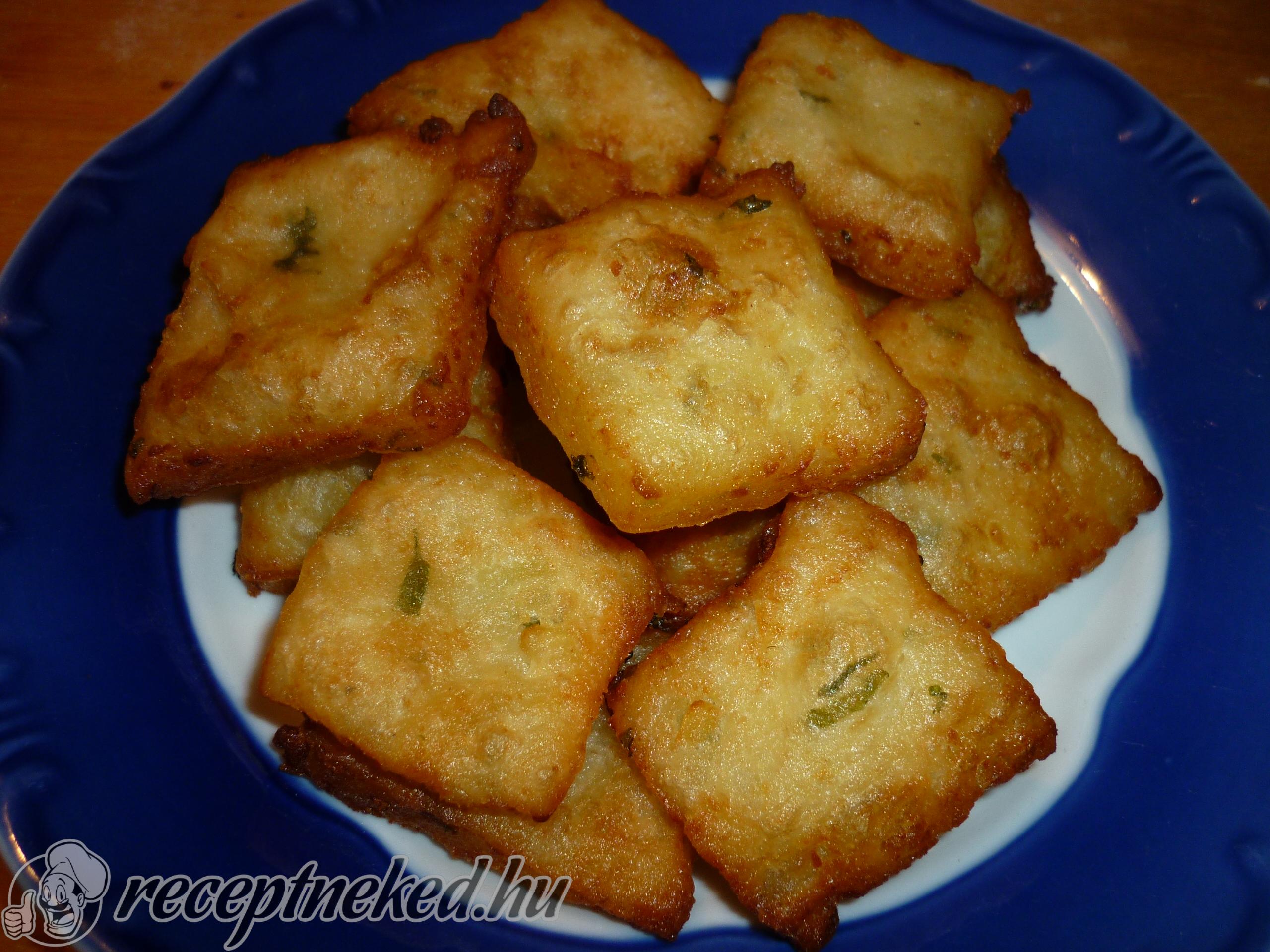 Kinyújtjuk és kocka formára vágjuk. Olajban kisütjük.
