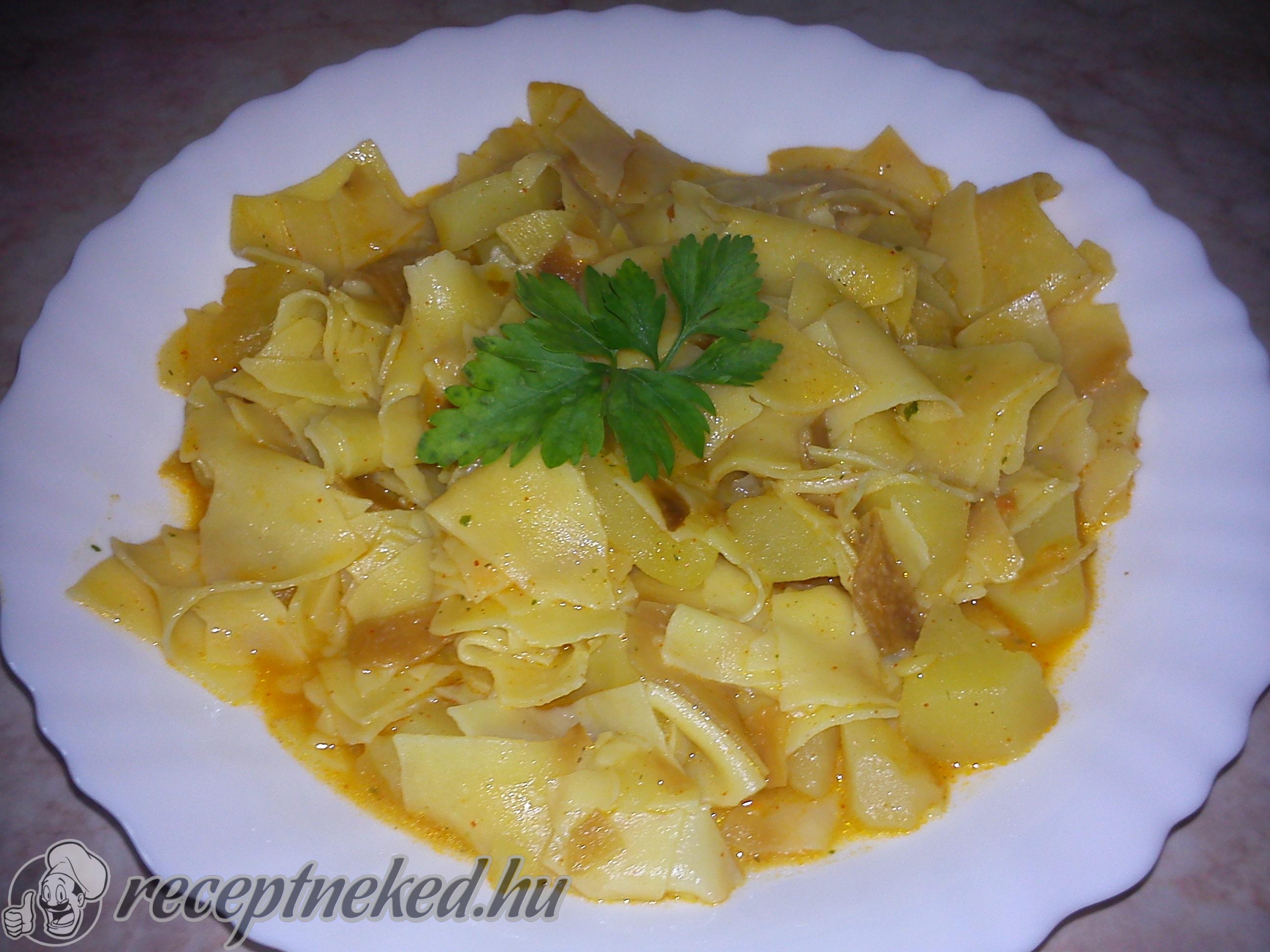 Egy lábasban olajat hevítünk, majd a lebbencstésztát megpirítjuk. A tűzről levéve megszórjuk piros paprikával, majd kiszedjük egy tányérra. A lábasba kevés vizet engedünk, és sóval, borssal, delikáttal fűszerezzük. Beletesszük a karikára vágott burgonyát, és puhára főzzük. Amikor a burgonya megfőtt, beletesszük a pirított tésztát és együtt készre főzzük.