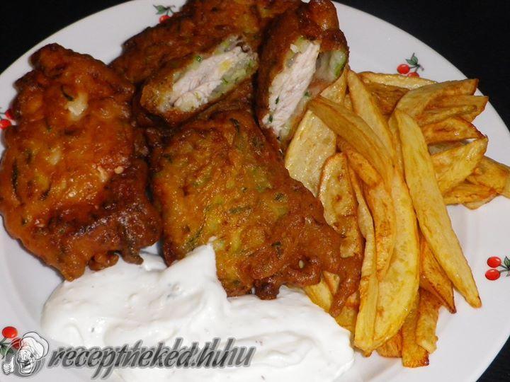 A csirkemellet megmossuk, felszeleteljük, majd a lisztbe és a cukkinis keverékbe mártjuk. Forró olajban szép pirosra sütjük.