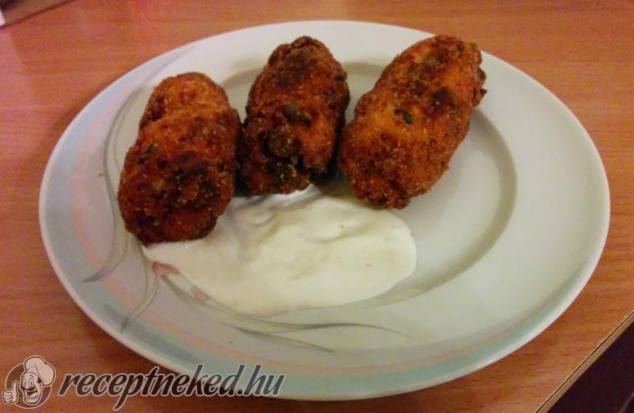 Gombócokat vagy hengereket formázunk belőle, beleforgatjuk zsemlemorzsába és forró olajban sütjük, amíg aranybarna színt nem kap.