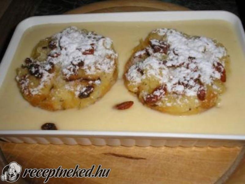 A mártásból egy keveset félreteszünk, a többit a kifliszeletekre öntjük, majd a tetejére mazsolát és goji bogyót szórunk, azután az előmelegített sütőbe, vízfürdőben kb 30 percig sütjük.