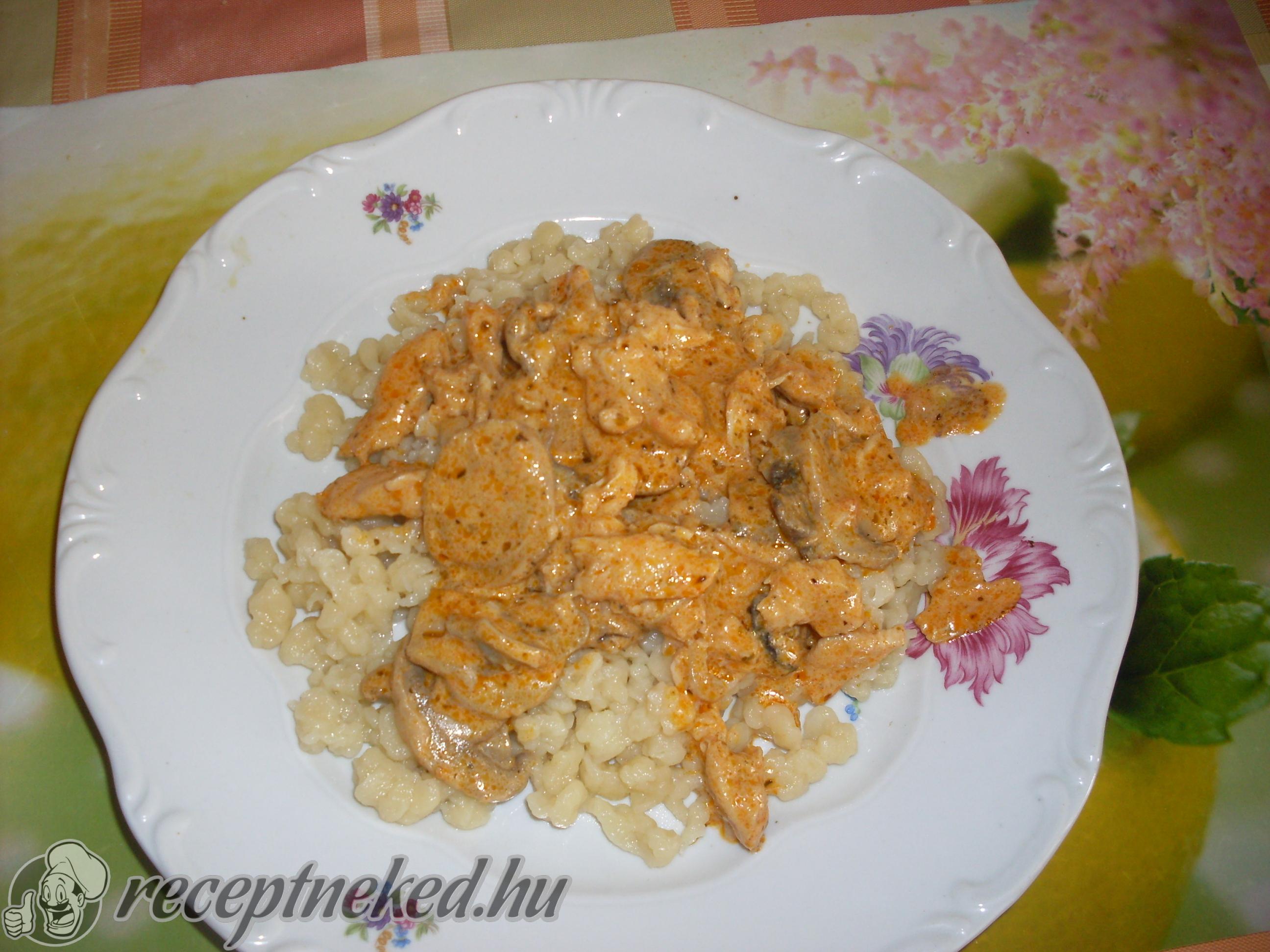 Amikor a csirke félig megpuhult, beletesszük a gombát, és együtt főzzük tovább. Ha megpuhult, meghintjük kevés liszttel, majd belekeverjük a tejfölt, és összeforraljuk.