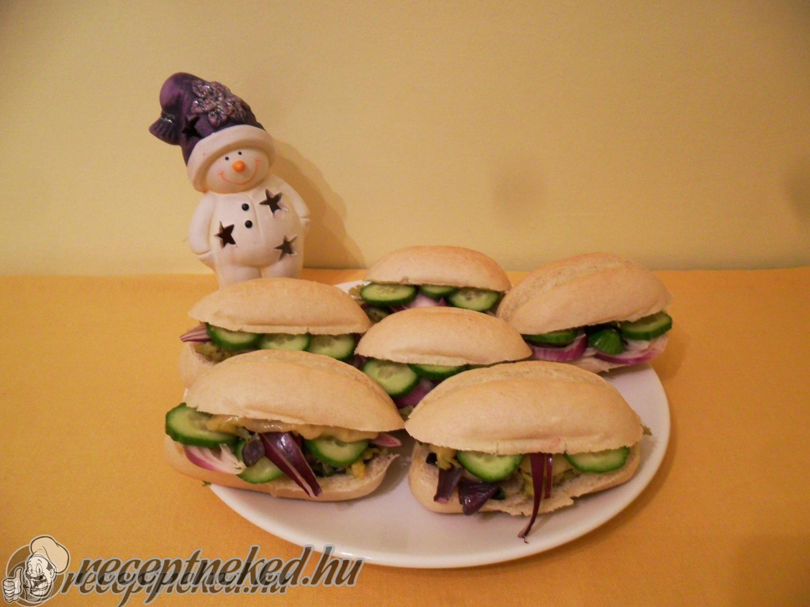 A kenyerekre vastagon rákenjük a feltétet és a sütőben szép barnára sütjük a szendvicseket.