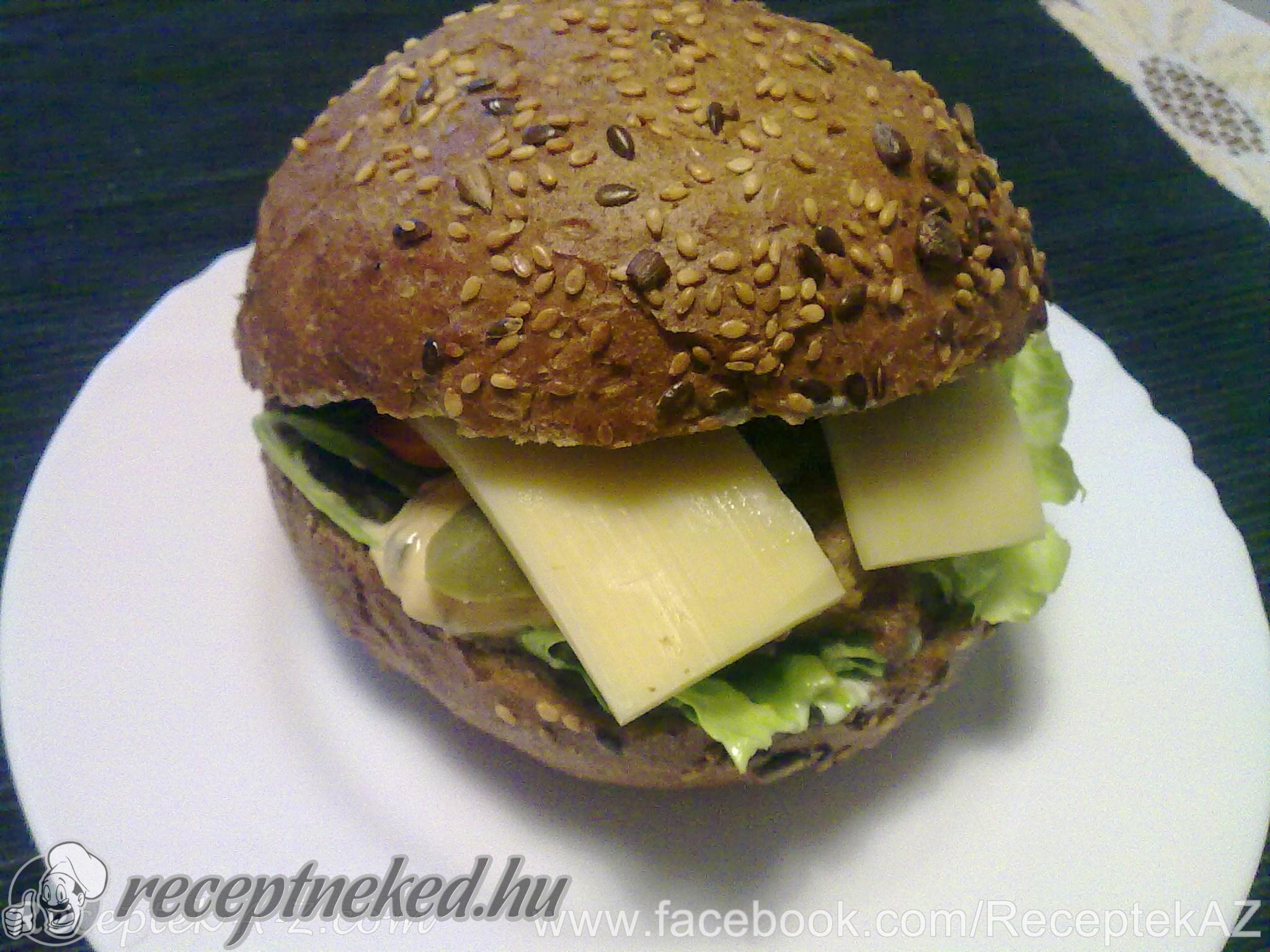 A zsemlét először tartármártással kenjük le, rátesszük a jégsaláta levelet, arra a paradicsomszeletet, rá a húspogácsát, a sajtot, az uborkát, végül a zsemle tetejét amerikai hamburgerszósszal kenjük meg (vagy tetszés és ízlés szerint állítjuk össze) Azonnal kínáljuk.