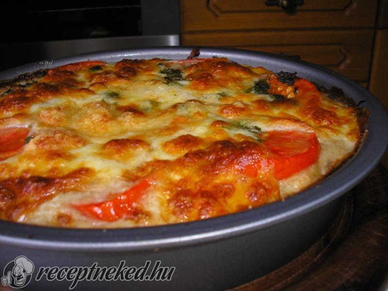 Egy 23 cm-es keskeny szélű, kerek sütőformát vajazzunk ki és szórjuk meg morzsával. A húsmasszát jól nyomkodjuk bele a formába. A paradicsomokat szeleteljük fel és a mozzarellát is. Felváltva kirakjuk a húslepény tetejét a sajttal és paradicsommal.