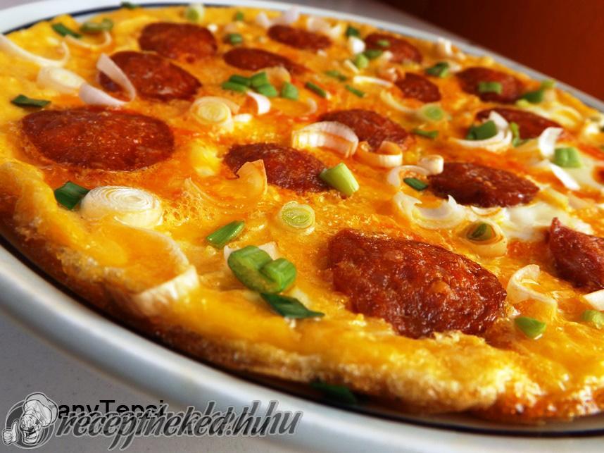 Szépen ráhalmozzuk a kolbász darabkákat. Megszórjuk az újhagymával.