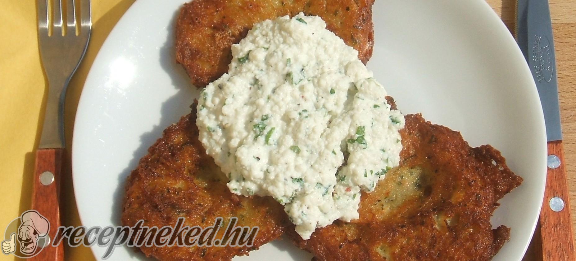 A krumplipecsenyéket frissen, melegen kínáljuk a fokhagymás-medvehagymás túróval.