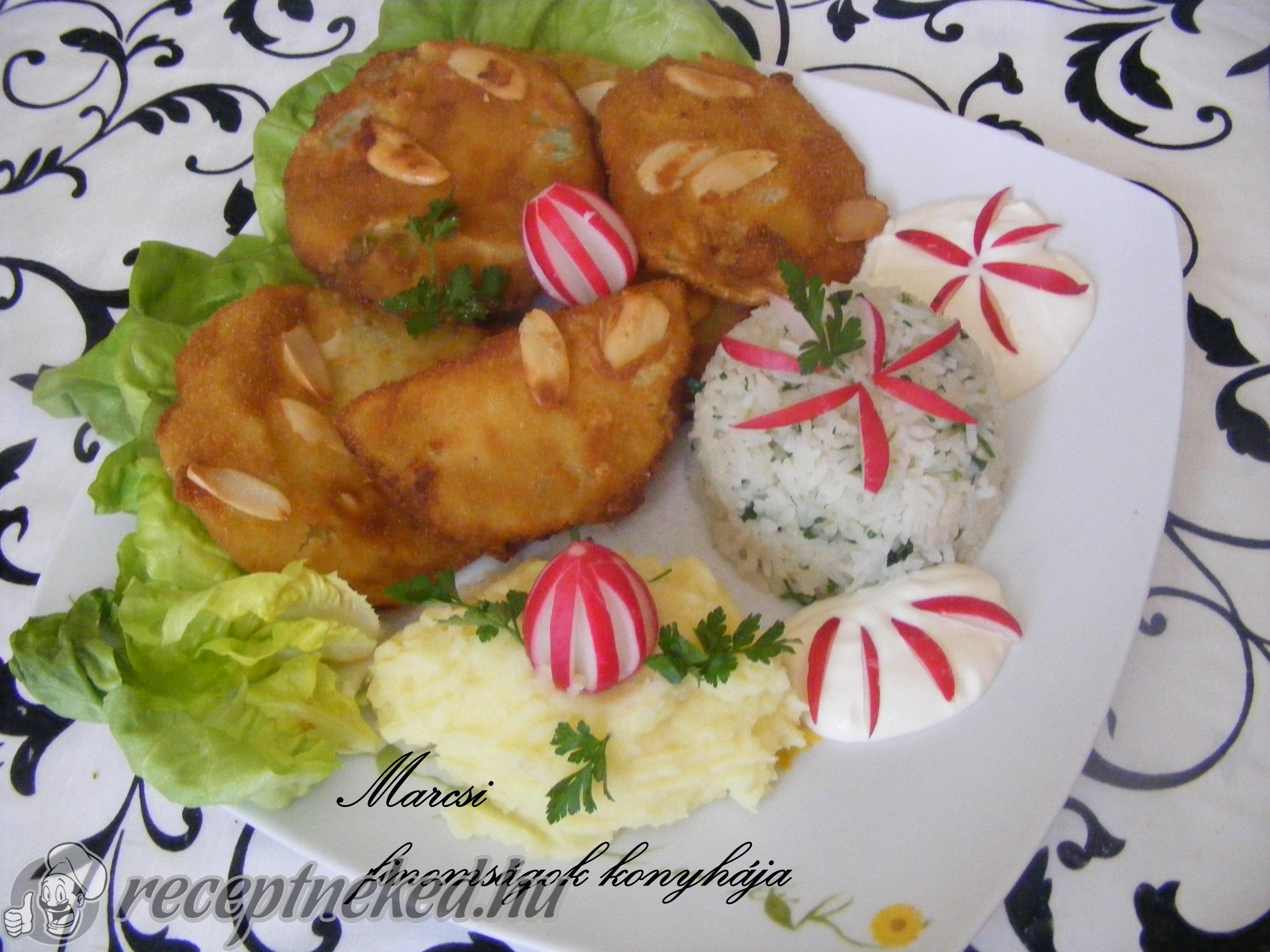 Kihűlés után sózzuk, borsozzuk, lisztbe, azután tojásba, majd a morzsával elkevert mandulába forgatjuk. Bő, forró olajban megsütjük. Burgonyapürével, rizzsel és majonézzel tálalhatjuk.