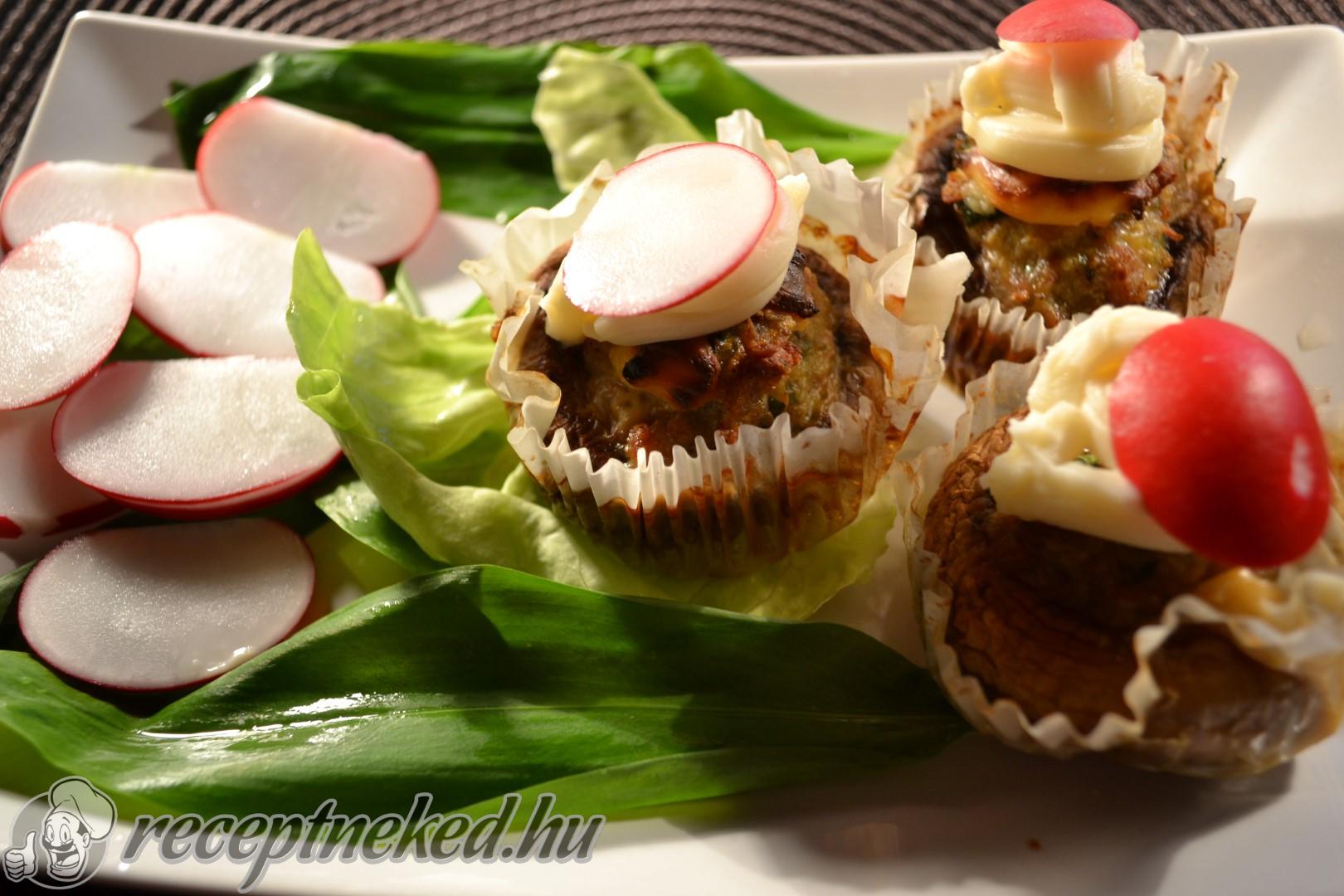 Három darab nagy gombafejet megsózunk, és teflon serpenyőben olajon kicsit megsütjük, de ez csak 1-2 perc, annyi hogy meglágyuljon, és be tudjuk tenni a sütőbe. A gombába teszünk egy kávéskanál tömlős krémsajtot, és erre rátesszük a darált húsos keveréket. /A többi muffint csak olajazott muffin papíron sütöttem./