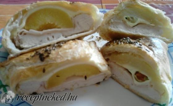 Minden tésztakockára teszünk egy darab húst, erre jön egy szelet barack, majd sonka és sajt.