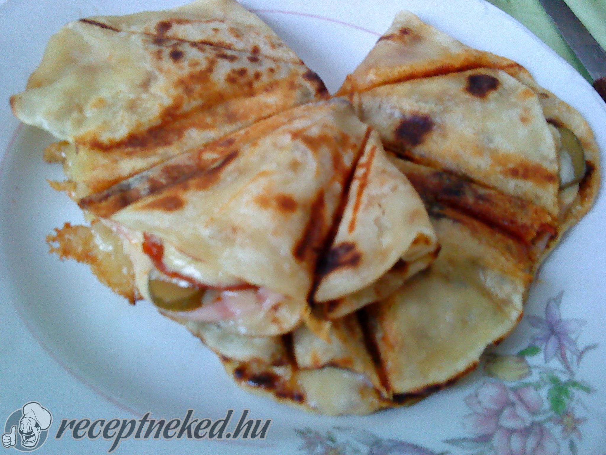 Ha kész a következő tölteléket tesszük bele. Gépsonkát terítünk egy lángosra, erre halmozzuk a vegyes vágottat, majd vastagon megszórjuk sajttal. Négybe hajtjuk a lángost és melegszendvics sütőben készre sütjük.