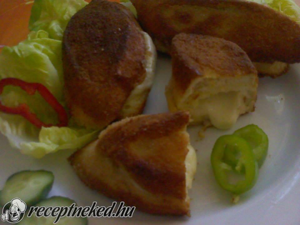Beleforgatjuk a zsemlemorzsába és jól összenyomjuk a szeleteket. Forró olajban kisütjük.