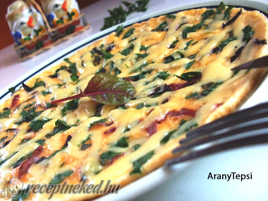 A vajatt serpenyőben felhevítjük, majd ráöntjük a tojásos keveréket és mindkét oldalát alacsony lángon aranybarnára sütjük, ügyelve arra, hogy forgatás közben az oldalai ne ragadjanak össze.